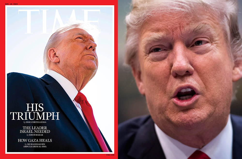 टाइम पत्रिकाको आवरणमा रहेको तस्बिरमा राष्ट्रपति ट्रम्प आत्मविश्वासका साथ अगाडि हेरिरहेको देखाइएको छ, र शीर्षक ‘उनको विजय’ भनेर लेखिएको छ । यो लेखक एरिक कोर्टेल्साद्वारा लेखिएको थियो । यसलाई मध्य पूर्वमा ट्रम्पको विजयको रूपमा चित्रण गरिएको छ ।