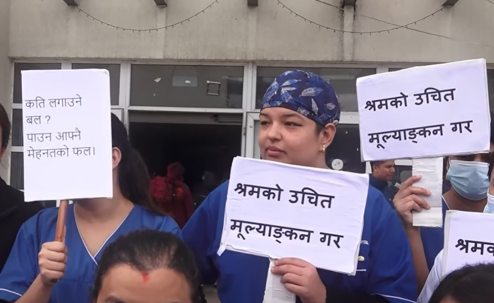 काठमाडौं । सरकारी ऐनले व्यवस्था गरे अनुसारको पारिश्रमिक भत्ता र सेवा–सुविधाको माग राख्दै आन्दोलित नर्सहरुको आन्दोलन जारी रहेको छ ।