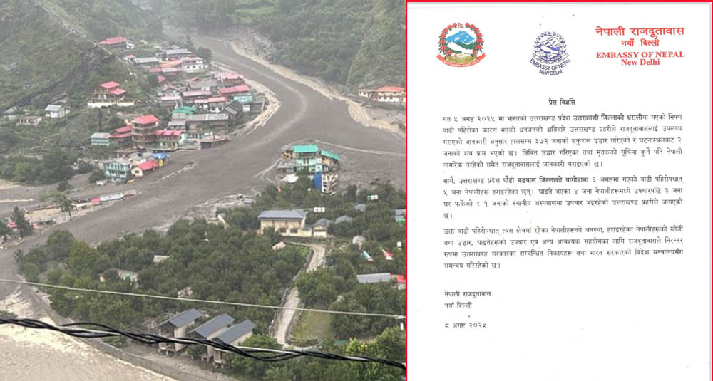 दुताबासले भनेको छ- ‘गत ५ अगष्ट २०२५ मा भारतको उत्तराखण्ड प्रदेश उत्तरकाशी जिल्लाको धरालीमा गएको भिषण बाढी पहिरोका कारण भएको धनजनको क्षतिबारे उत्तराखण्ड प्रहरीले राजदूतावासलाई उपलब्ध गराएको जानकारी अनुसार हालसम्म ३७२ जनाको सकुशल उद्धार गरिएको र घटनास्थलबाट २ जनाको शव प्राप्त भएको छ । जिवित उद्धार गरिएका तथा मृतकको सूचिमा कुनै पनि नेपाली नागरिक नरहेको समेत राजदूतावासलाई जानकारी गराइएको छ ।’