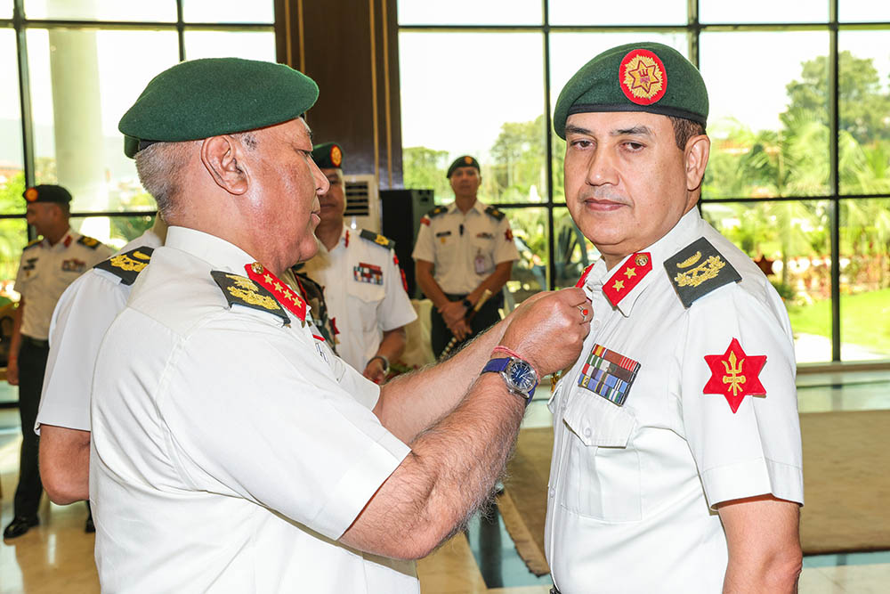 काठमाडौँ । नेपाली सेनाको उपरथी दर्जामा पदोन्नति भएका सहायक रथी भोला नाथ थापालाई प्रधानसेनापति अशोक राज सिग्देलले दर्ज्यानी चिन्ह प्रदान गरेका छन् ।