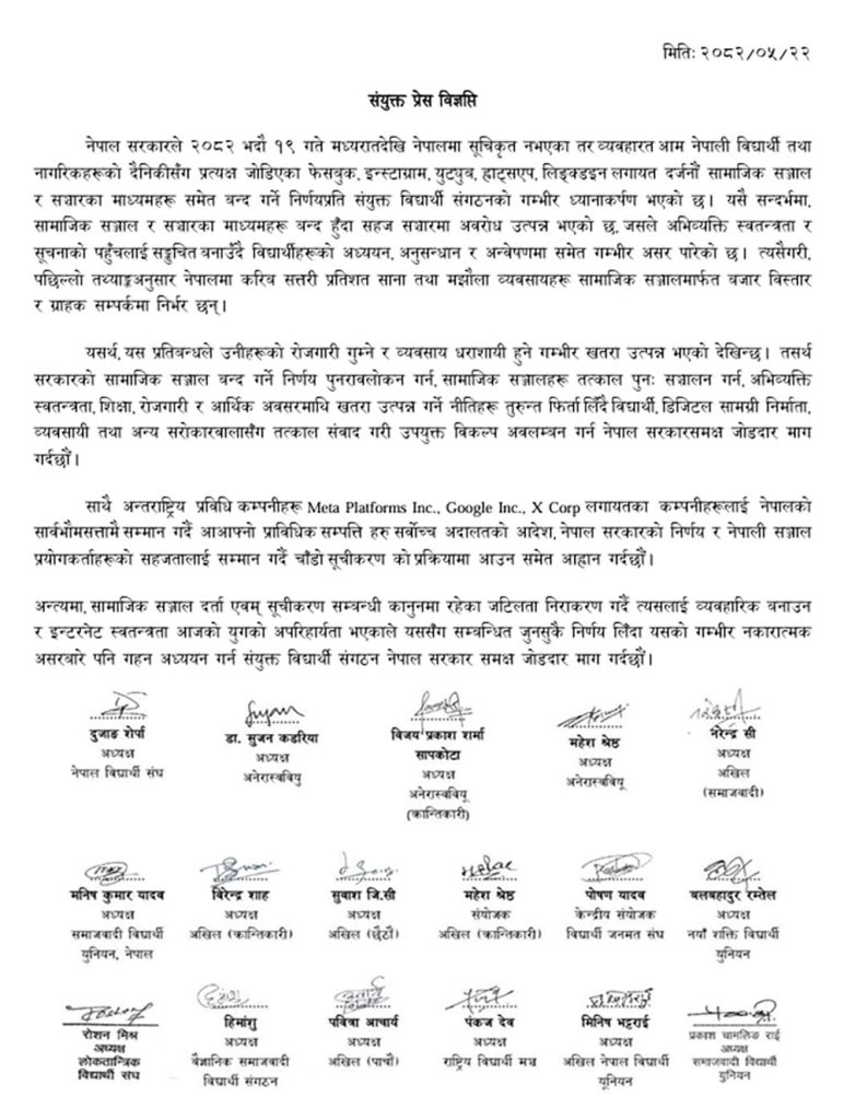 विज्ञप्तिमा भनिएको छ- ‘सामाजिक सञ्जाल र सञ्चारका माध्यम बन्द हुँदा सहज सञ्चारमा अवरोध उत्पन्न भएको छ, जसले अभिव्यक्ति स्वतन्त्रता र सूचनाको पहुँचलाई सङ्कुचित बनाउँदै विद्यार्थीको अध्ययन, अनुसन्धान र अन्वेषणमा समेत गम्भीर असर पारेको छ । त्यसैगरी, पछिल्लो तथ्यांकअनुसार नेपालमा करिब सत्तरी प्रतिशत साना तथा मझौला व्यवसायहरू सामाजिक सञ्जालमार्फत बजार विस्तार र ग्राहक सम्पर्कमा निर्भर छन् ।’