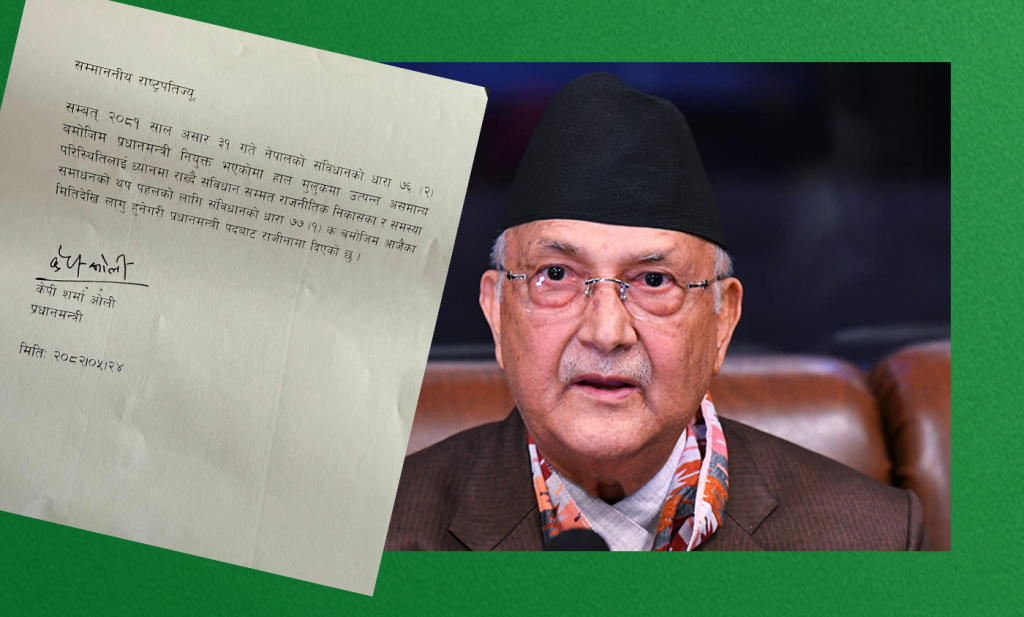 हाल मुलुकमा उत्पन्न असामान्य परिस्थितिलाई ध्यानमा राख्दै आफूले पदबाट राजीनामा दिएको ओलीले राष्ट्रपति रामचन्द्र पौडेललाई सम्बोधन गरेर पठाएको पत्रमा उल्लेख छ ।