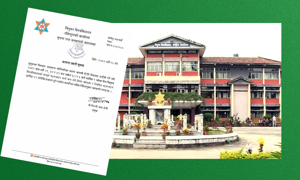 त्रिभुवन विश्वविद्यालयले सूचना प्रकाशित गर्दै मुलुकभर विद्यमान असामान्य परिस्थितिका कारण हाललाई सम्पूर्ण पठनपाठन बन्द गरिएको र नियमित पठन पाठन कार्तिक ११ गतेदेखि हुने जानकारी दिएको छ ।