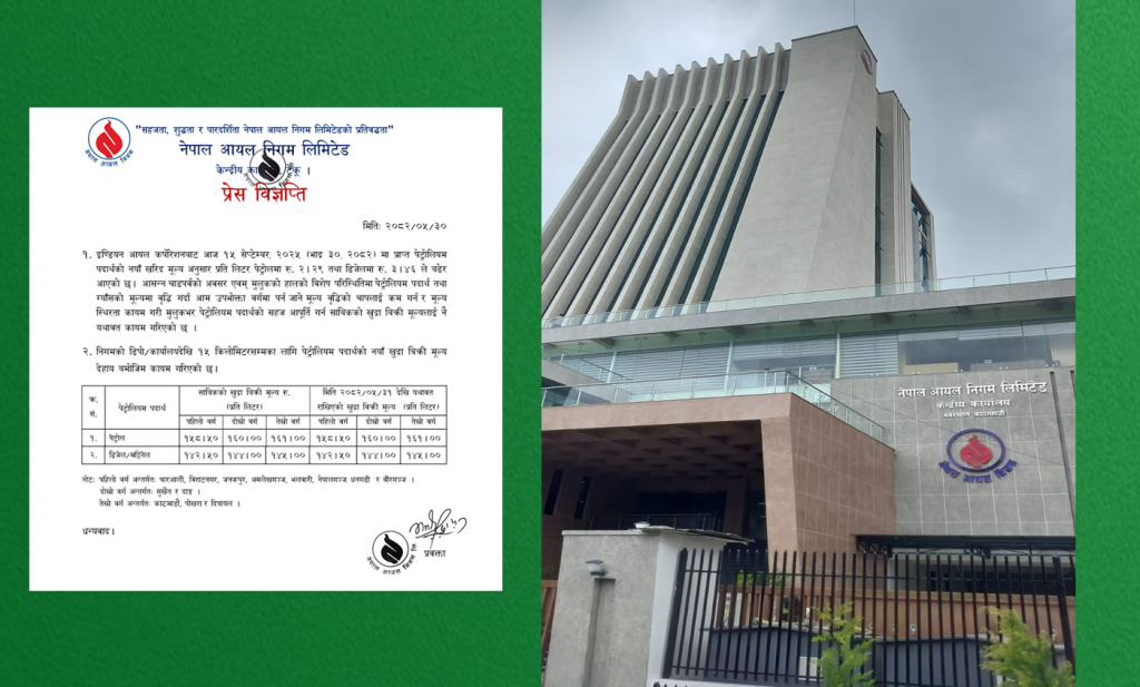 निगमले पेट्रोलमा प्रतिलिटर २.२९ रुपैयाँ र डिजलमा ३.४६ रुपैयाँ बढेर आएको जानकारी दिएको छ । हाल काठमाडौँमा पेट्रोल प्रतिलिटर १६१ रुपैयाँ र डिजल तथा मट्टीतेलको प्रति लिटर १४५ रहेको छ ।