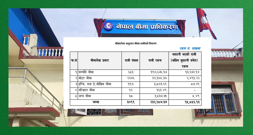 २३ असोजसम्म भएको दाबी भुक्तानीमध्ये सबैभन्दा बढी १ अर्ब ३२ करोड ७२ लाख सम्पत्ति बीमा (घरसम्पत्ति) अन्तर्गतको रहेको छ । सम्पत्ति बीमामा सबैभन्दा बढी १९ अर्ब ६ करोड ७६ लाख दाबि परेको छ । त्यस्तै मोटर बीमामा ३ अर्ब ४१ करोड ६ लाख दाबि परेकोमा २४ करोड ९१ लाख मात्र अहिलेसम्म भुक्तानी भएकोछ ।