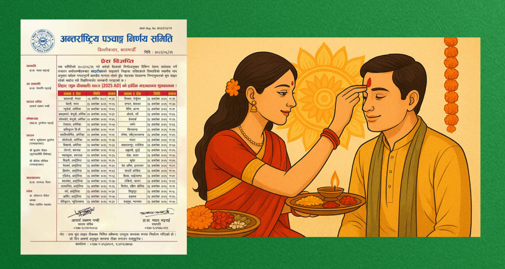 काठमाडौं । नेपाल पञ्चाङ्ग निर्णायक विकास समितिले यस वर्षको तिहारको भाइटीकाको उत्तम साइत सार्वजनिक गरेको छ । कात्तिक ६ गते बिहीबार बिहान ११ : ३९ बजे भाइटीकाको साइत उत्तम रहेको समितिले जानकारी दिएको छ ।