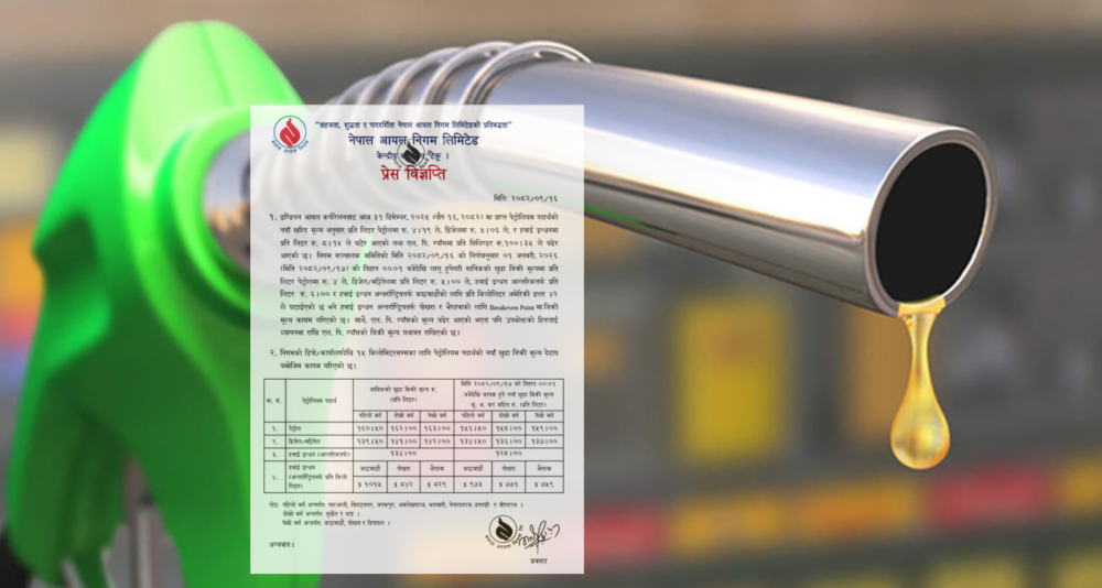 निगमले बुधबार राति १२ बजेदेखि लागु हुने गरि पेट्रोलमा प्रतिलिटर ४ रुपैयाँले घटाएको छ भने डिजल तथा मट्टीतेलमा प्रतिलिटर ५ रुपैयाँले घटाएको छ । त्यस्तै हवाई इन्धनमा आन्तरिक तर्फ प्रति लिटर ६ ले घटाएको निगमले जनाएको छ । त्यस्तै अन्तर्राष्ट्रिय इन्धनमा प्रति किलो लिटर ४२ डलरले घटाएको छ ।