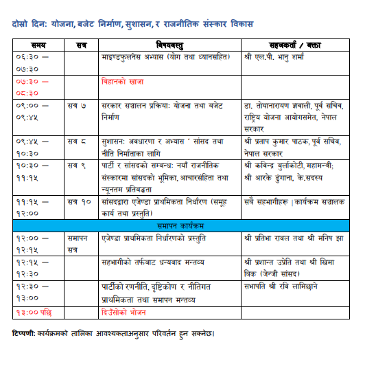 ललितपुरको ग्वार्कोस्थित होटेल रोयल टुलिपमा मंगलबारदेखि सुरु भएको कार्यक्रममा पहिलो दिन उपसभापतिद्वय स्वर्णिम वाग्ले र डीपी अर्यालले उद्घाटन गरेका थिए। तर, प्रमुख नेतृत्वको अपेक्षा गरिएका लामिछाने र शाह भने सो सत्रमा देखिएका थिएनन्।
