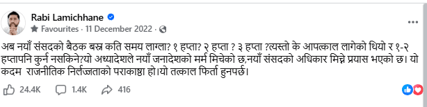 यसबीच, रवि लामिछाने ले विगतमा अध्यादेशको विरोध गरेको अभिव्यक्ति फेरि चर्चामा आएको छ। प्रतिपक्षमा रहँदा उनले अध्यादेशलाई संसद्को अधिकारमाथि हस्तक्षेप भन्दै कडा आलोचना गरेका थिए।