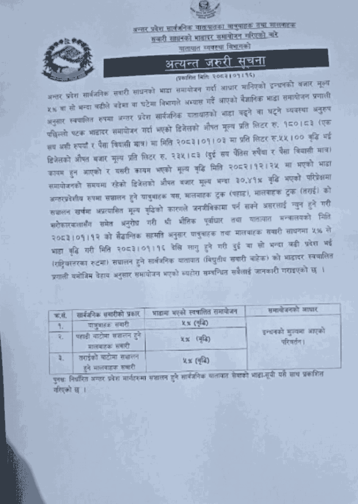 यातायात व्यवस्था विभागका निर्देशक मणि भुसालका अनुसार अन्तरप्रदेश सञ्चालन हुने सार्वजनिक यातायातमा नयाँ भाडादर लागू भइसकेको छ। उनका अनुसार इन्धन मूल्यमा भएको उल्लेख्य वृद्धिलाई आधार बनाएर भाडा समायोजन गरिएको हो।