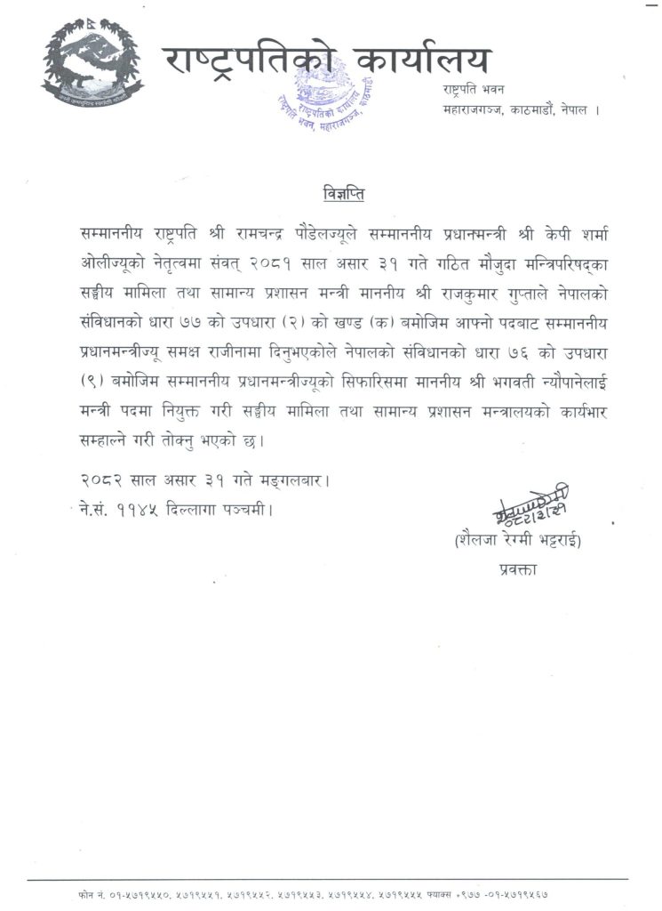 संविधानको धारा ७६ को उपधारा (९) बमोजिम सम्माननीय प्रधानमन्त्रीको सिफारिसमा न्यौपानेलाई मन्त्री पदमा नियुक्त गरी सङ्घीय मामिला तथा सामान्य प्रशासन मन्त्रालयको कार्यभार सम्हाल्ने गरी तोकेको शितलनिवासले जनाएको छ ।