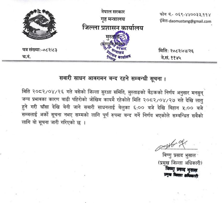 मुस्ताङको घाँसा-बेनी सडक खण्ड रातिमा बन्द हुने
